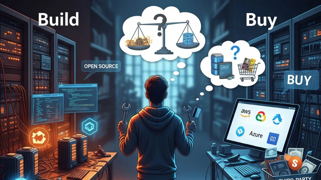 For internal infrastructure, building means ongoing maintenance, security updates, and feature development. Buying means subscription costs, integration complexity, and dependency risks.